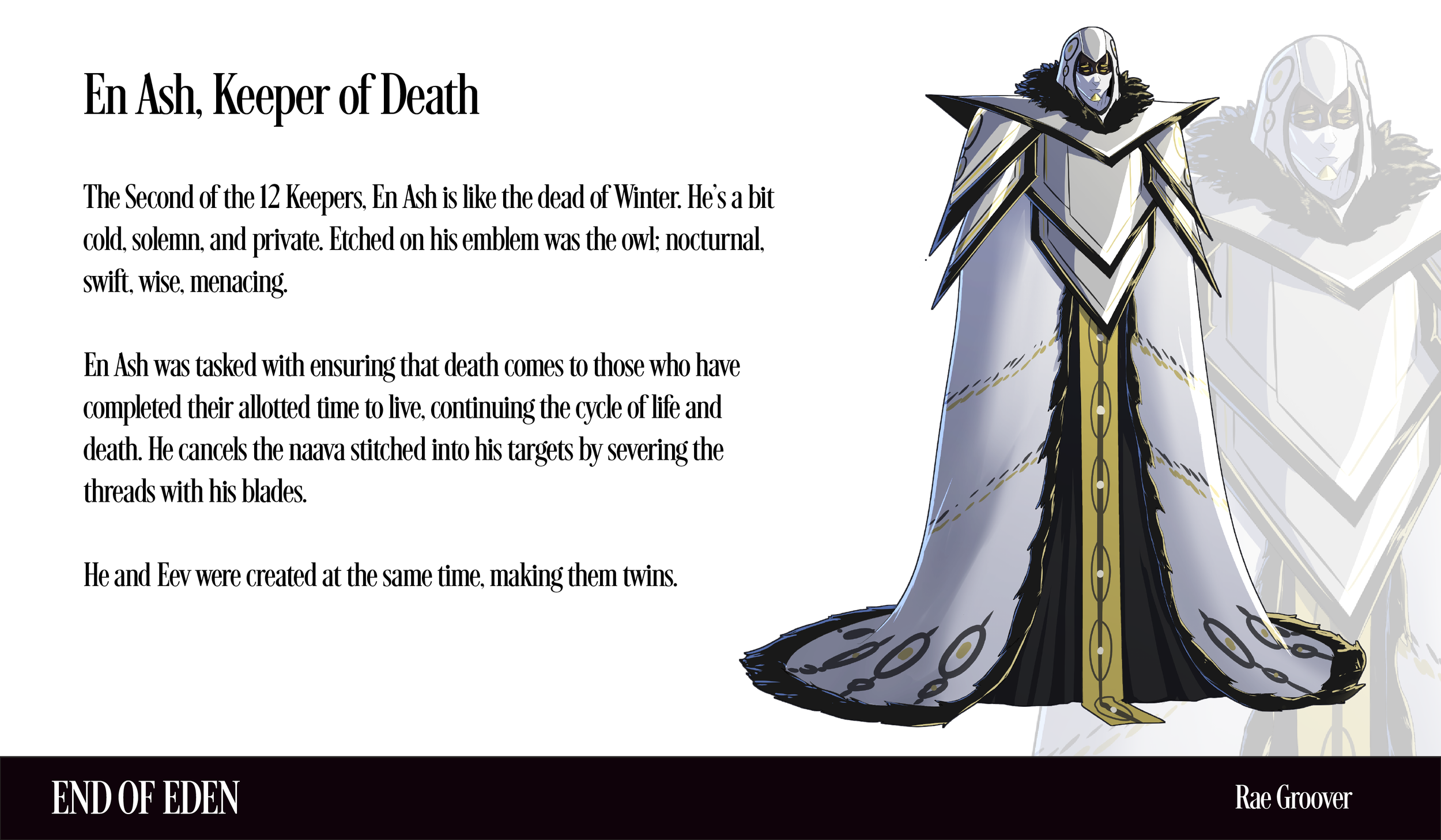 The Second of the 12 Keepers, En Ash is like the dead of Winter. He’s a bit cold, solemn, and private. Etched on his emblem was the owl; nocturnal, swift, wise, menacing.
