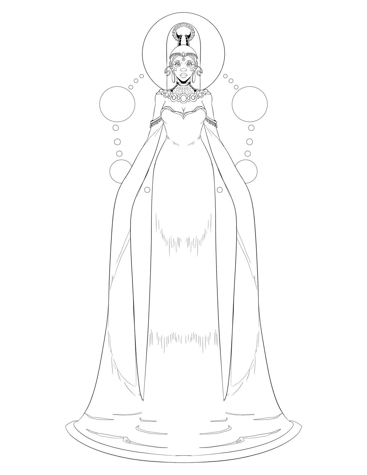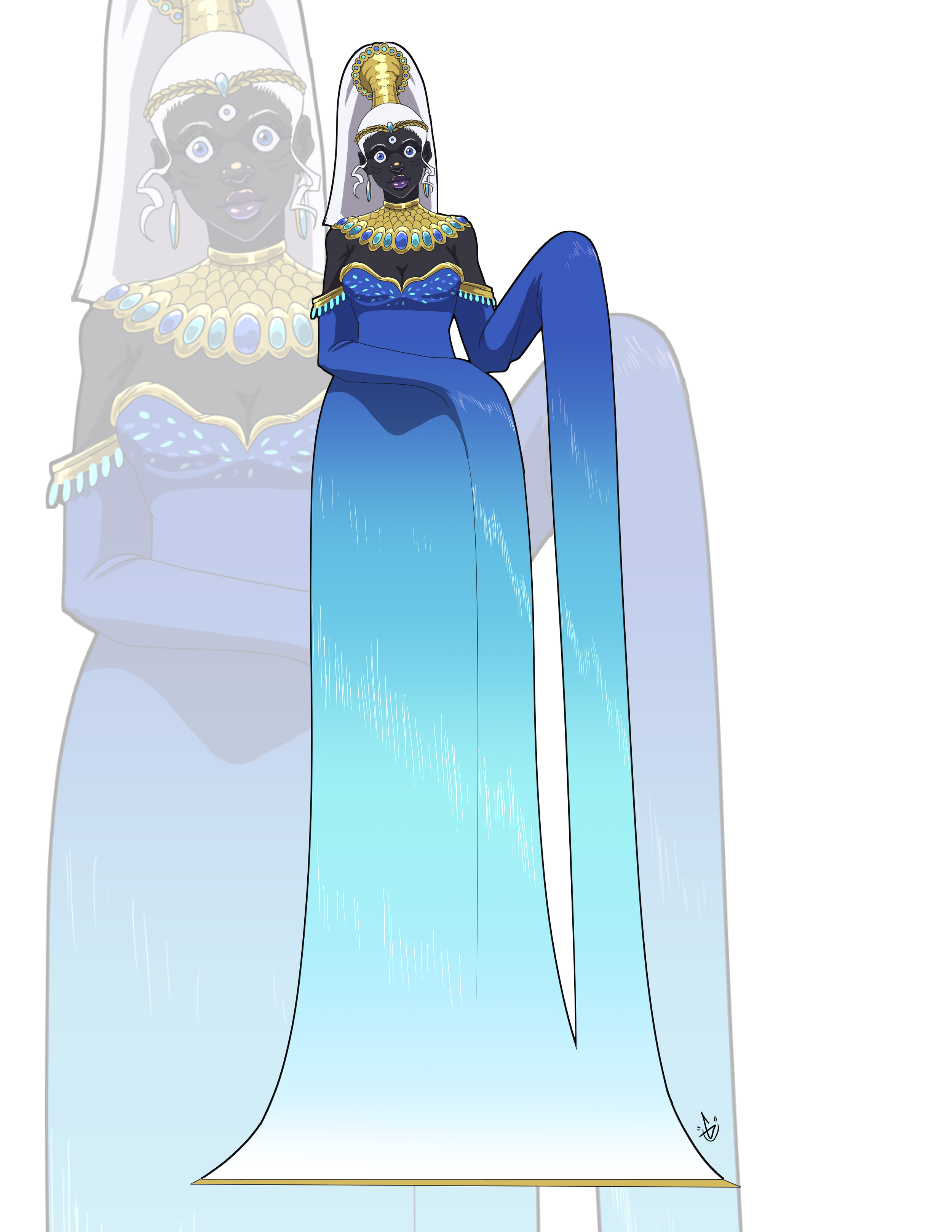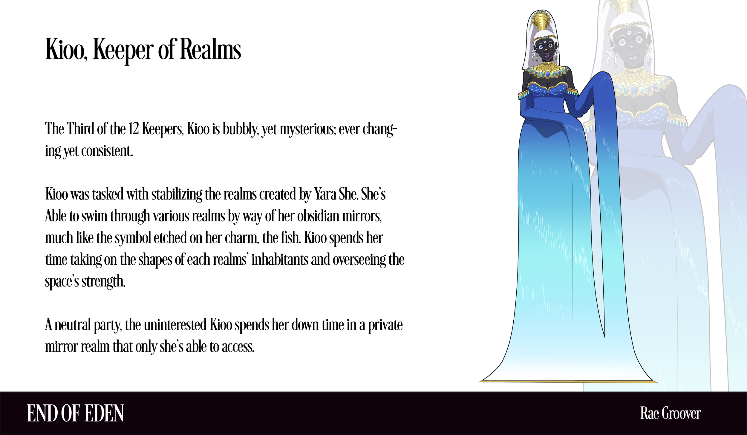Kioo was tasked with stabilizing the realms created by Yara She. She’s Able to swim through various realms through her obsidian mirrors, much like the symbol etched on her charm, the fish. Kioo takes on the shapes of each realm’s inhabitants and oversees the space’s strength.