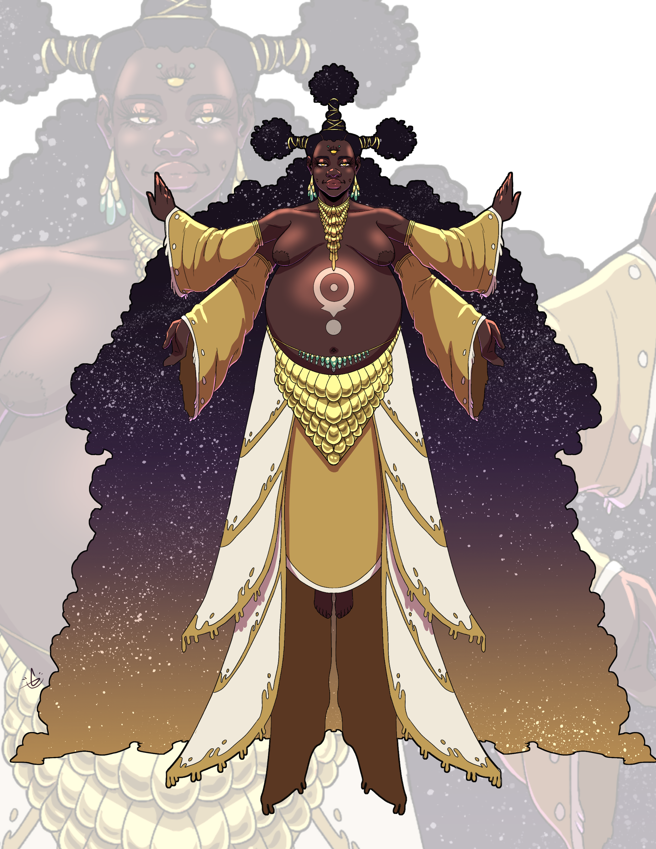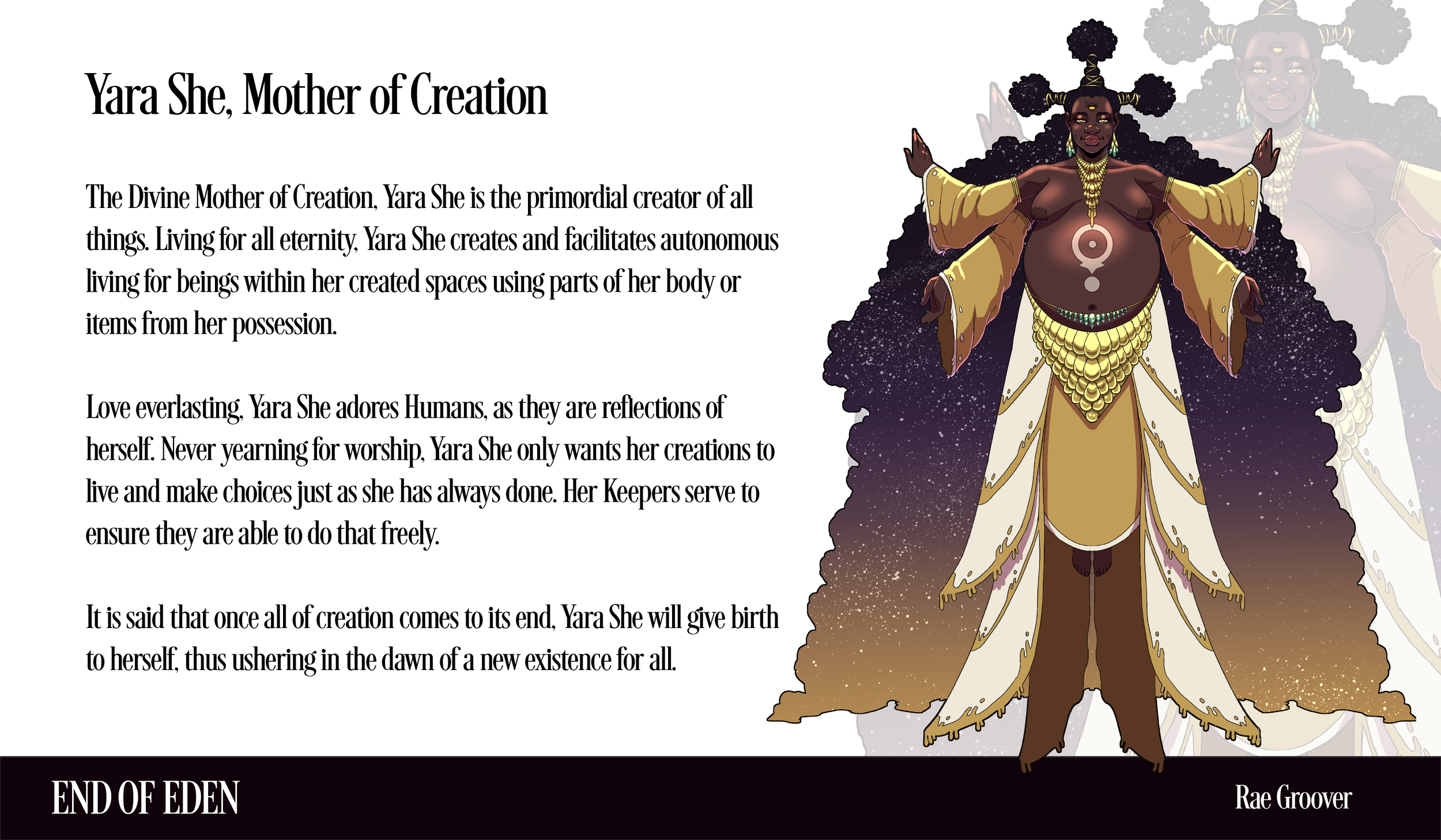 The Divine Mother of Creation, Yara She is the primordial creator of all things. Living for all eternity, Yara She creates and facilitates autonomous living for beings within her created spaces using parts of her body or items from her possession.